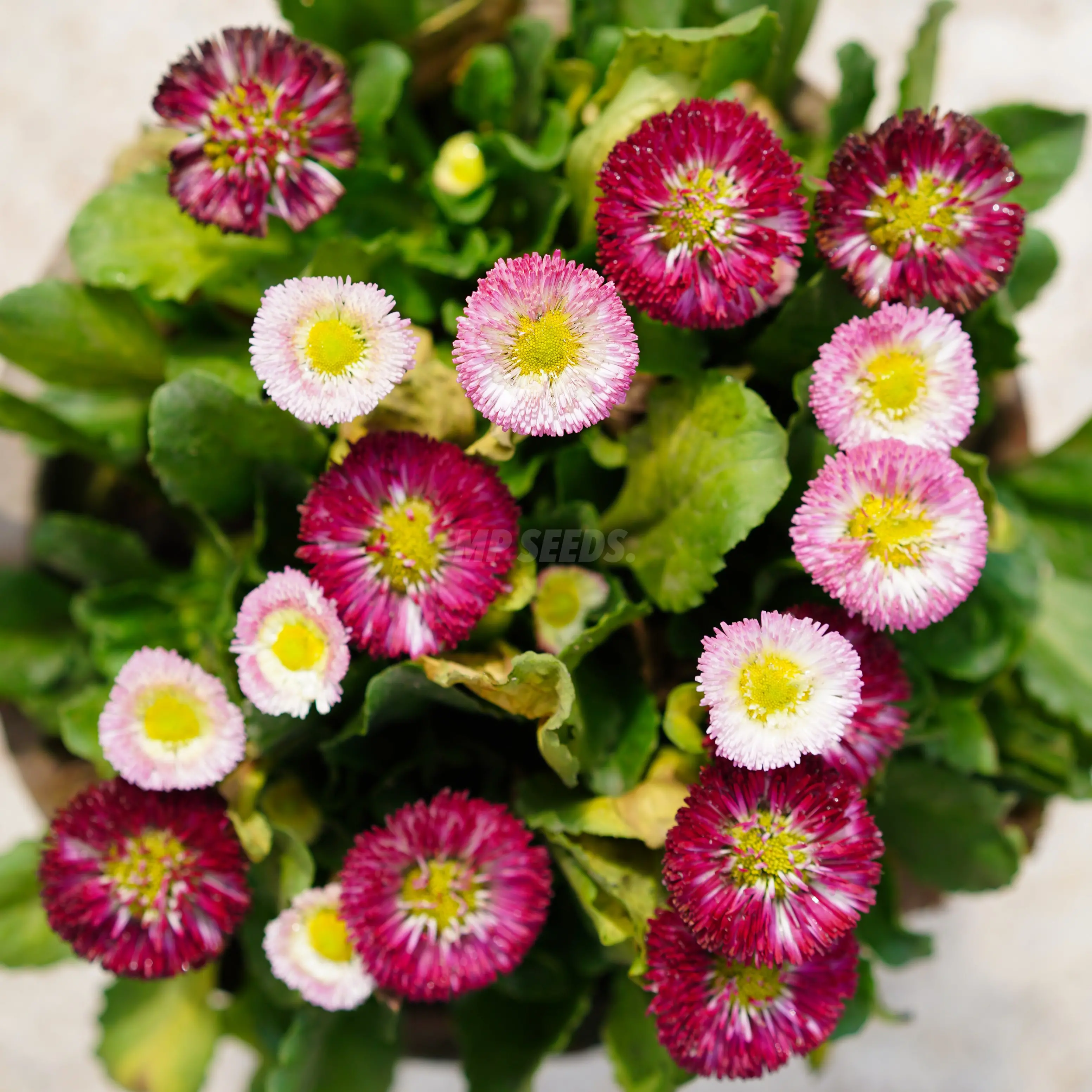 Daisy Monstrosa Mix, also known as Bellis perennis or English Daisy, is a compact flowering plant grown for its dense, pompon-shaped blooms in shades of white, pink, and red. This variety stands out thanks to its fully double flowers with rolled petals, creating a rich, textured look that works both in gardens and on the plate.